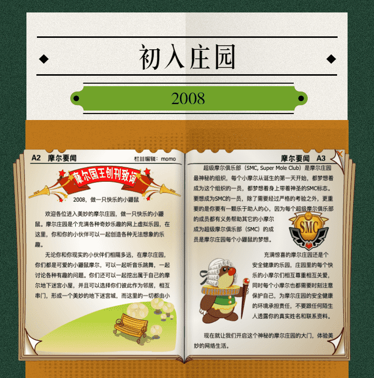 在这一年,,,摩尔庄园诞生了。。在这里,,,,大家都是可爱的红鼻子鼹鼠小摩尔,,,可以一起勤劳耕作,,,一起高山滑雪......我们都是摩尔庄园的建设者。。