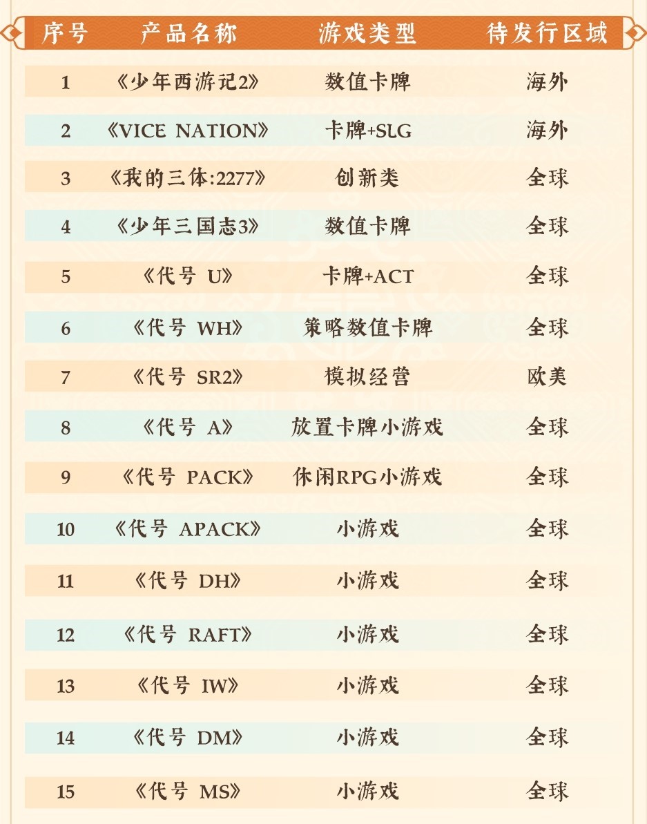 首款《三体》IP正版授权游戏《我的三体:::2277》已开放预约,,,另有现代都市题材SLG《Vice Nation》、、少年系列重磅新品《少年三国志3》、、、、模拟经营全平台游戏《代号::::SR2》等产品储备。。此外在小游戏赛道上,,《代号 A》《代号 Pack》《代号 DH》等也将陆续开启测试,,,伴随多款新品的陆续上线有望进一步撬动增长空间。。